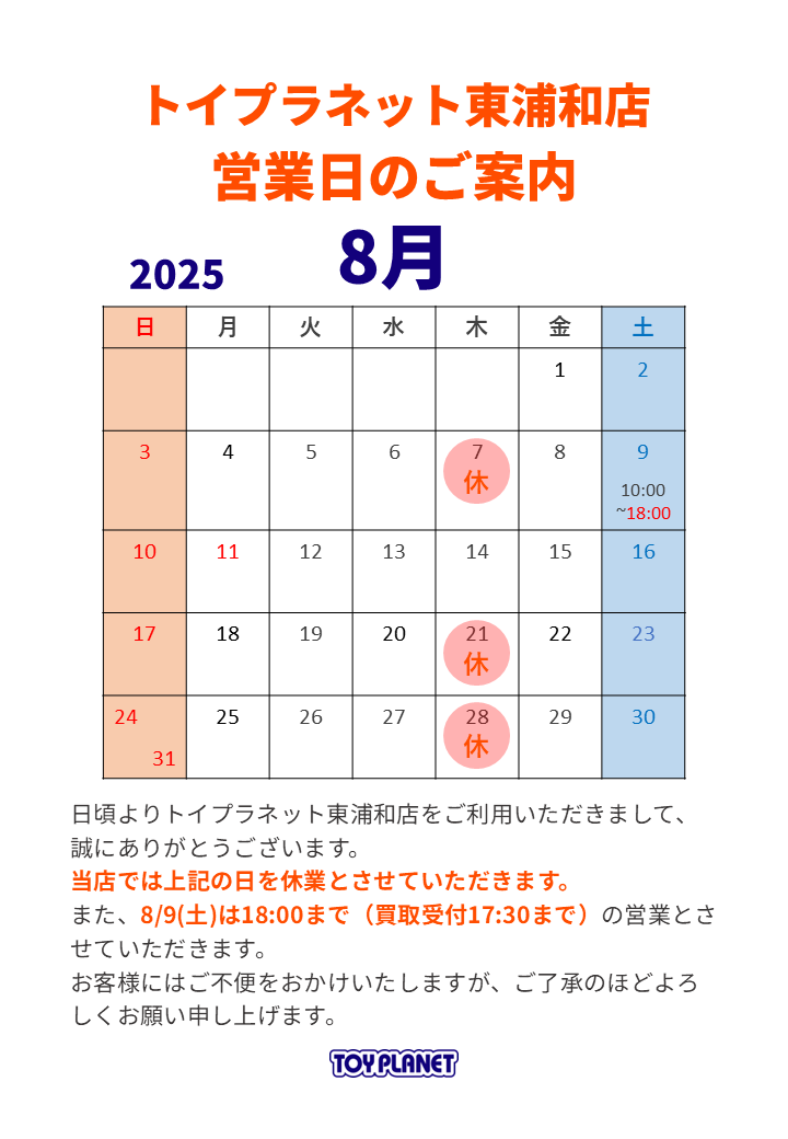 東浦和店8月の営業日・休業日のご案内です。 皆様のご来店を心よりお待ちしております。